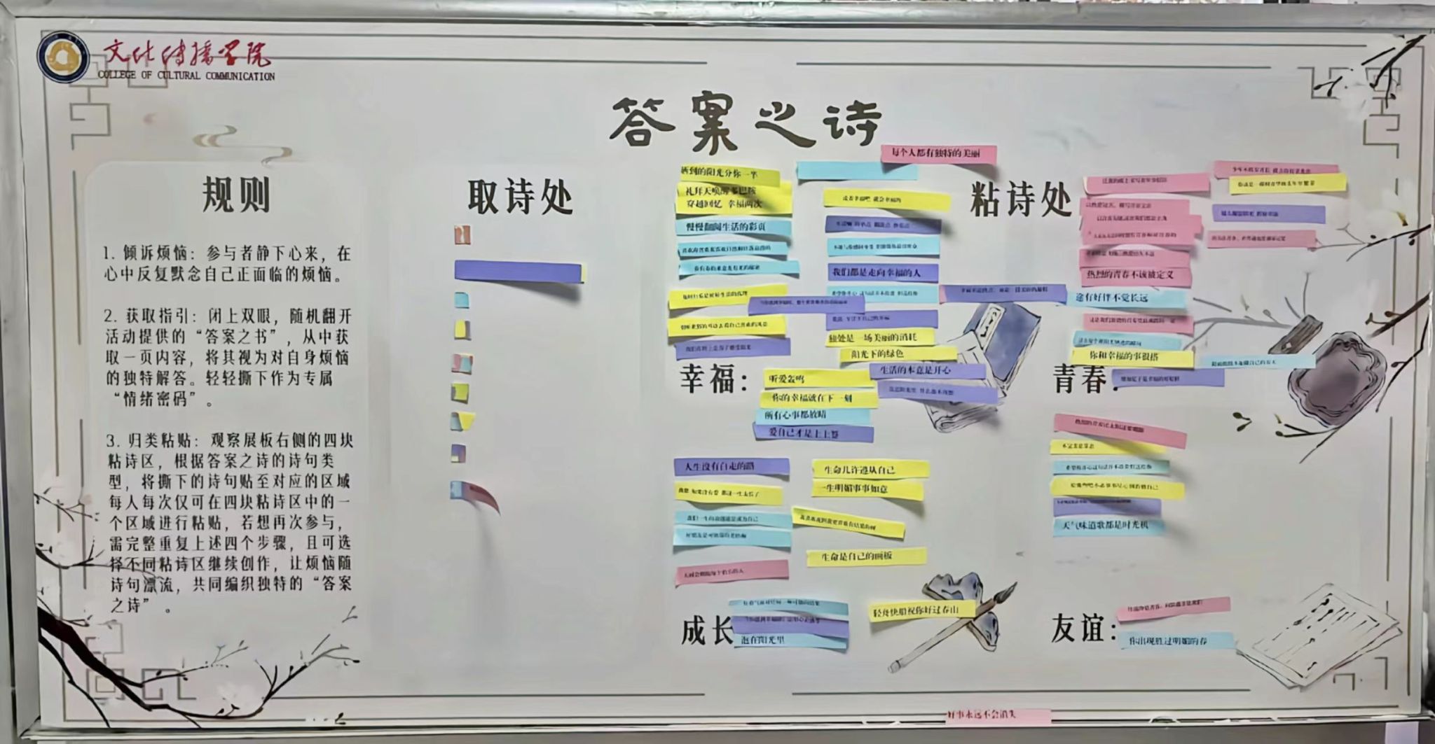 本次活动以诗歌创作为载体,构建起心理健康教育与文学创作深度融合的实践平台。互动展板设置四个区域,参与者通过翻阅“答案之书”,将随机获取的哲学箴言、文学片段与个人感悟相结合,撕下心仪的话语贴纸粘贴到展板上。大家或用诗意勾勒出“青春”的热烈,或在字句间诉说“友谊”的珍贵,或拼凑出对“幸福”的深刻理解,或留下自身独特的“成长”感悟。用艺术化的情绪表达方式,强化了学生积极的心理体验。现场同学表示:“从写下烦恼到拼贴诗句,我仿佛在文字里与自己和解,那些零散的句子,拼凑出了治愈心灵的独特力量。”