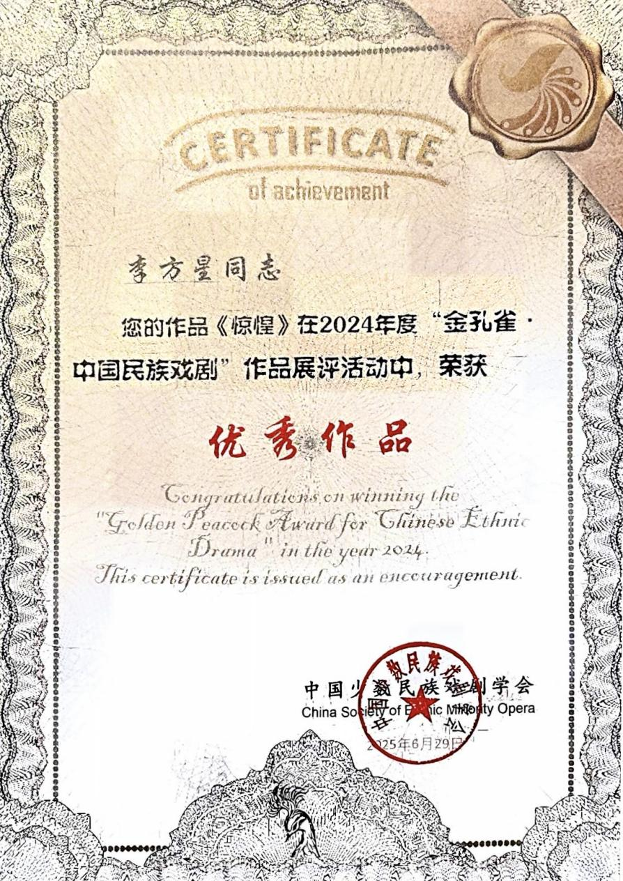 6月29日,“金孔雀·中国民族戏剧”2024年度评优作品暨全国京剧票友培训大赛荣誉颁发典礼在山东省青岛市崂山区举行。文化传播学院教师李方星的作品《惊惶》凭借独特的创作视角、深厚的文化内涵以及精湛的艺术表现力,在众多作品中脱颖而出,荣获“小剧场”类“优秀奖”。