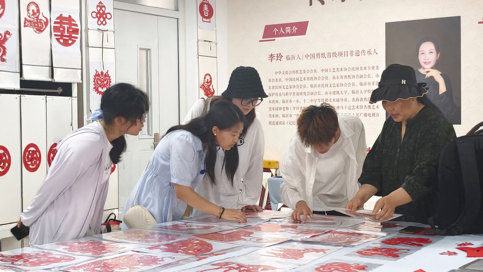 剪纸艺术作为中国民间传统艺术之一,具有独特的艺术风格和文化内涵。7月1日,团队成员来到了临沂市银雀山小学,参观了省级剪纸非遗传承人李玲老师的剪纸工作室,工作室的墙上挂满了李老师多年来根据各种活动和题材创作出来的“沂蒙故事专区”“抗日战争专区”和“二十四节气专区”剪纸作品。李玲老师以“单色剪纸基础手法”为切入点,耐心地向团队成员传授了传统非遗剪纸技艺,在老师的指导下,团队成员们小心翼翼地尝试着剪出各种图案,从简单的线条到复杂的造型,每一个步骤都凝聚着团队成员对学习剪纸艺术的渴望与专注。