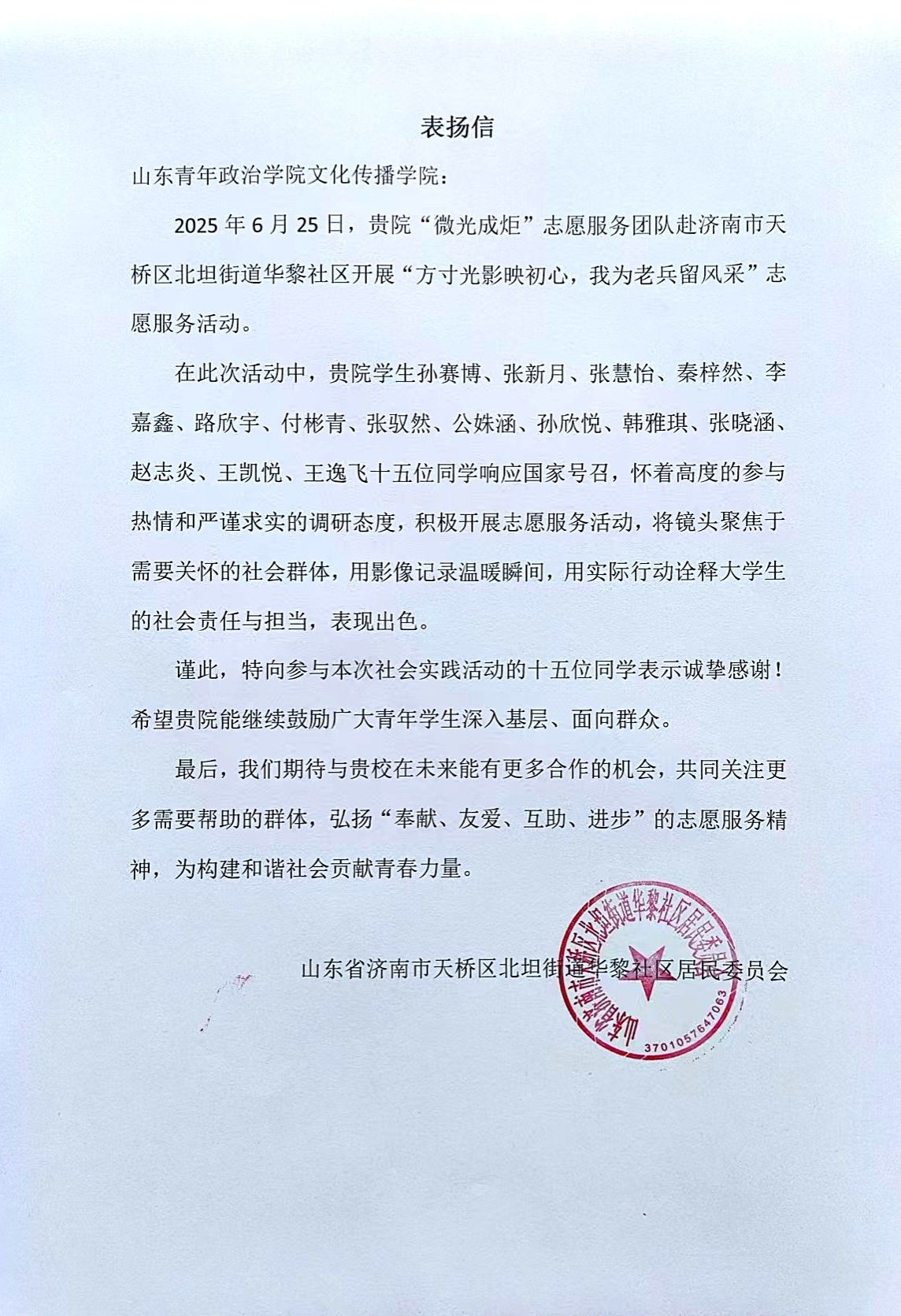 近日,山东省济南市天桥区北坦街道华黎社区向文化传播学院“微光成炬”志愿服务团队发来表扬信,对孙赛博、张新月、张慧怡等15位同学的志愿服务活动给予了高度认可与表扬。