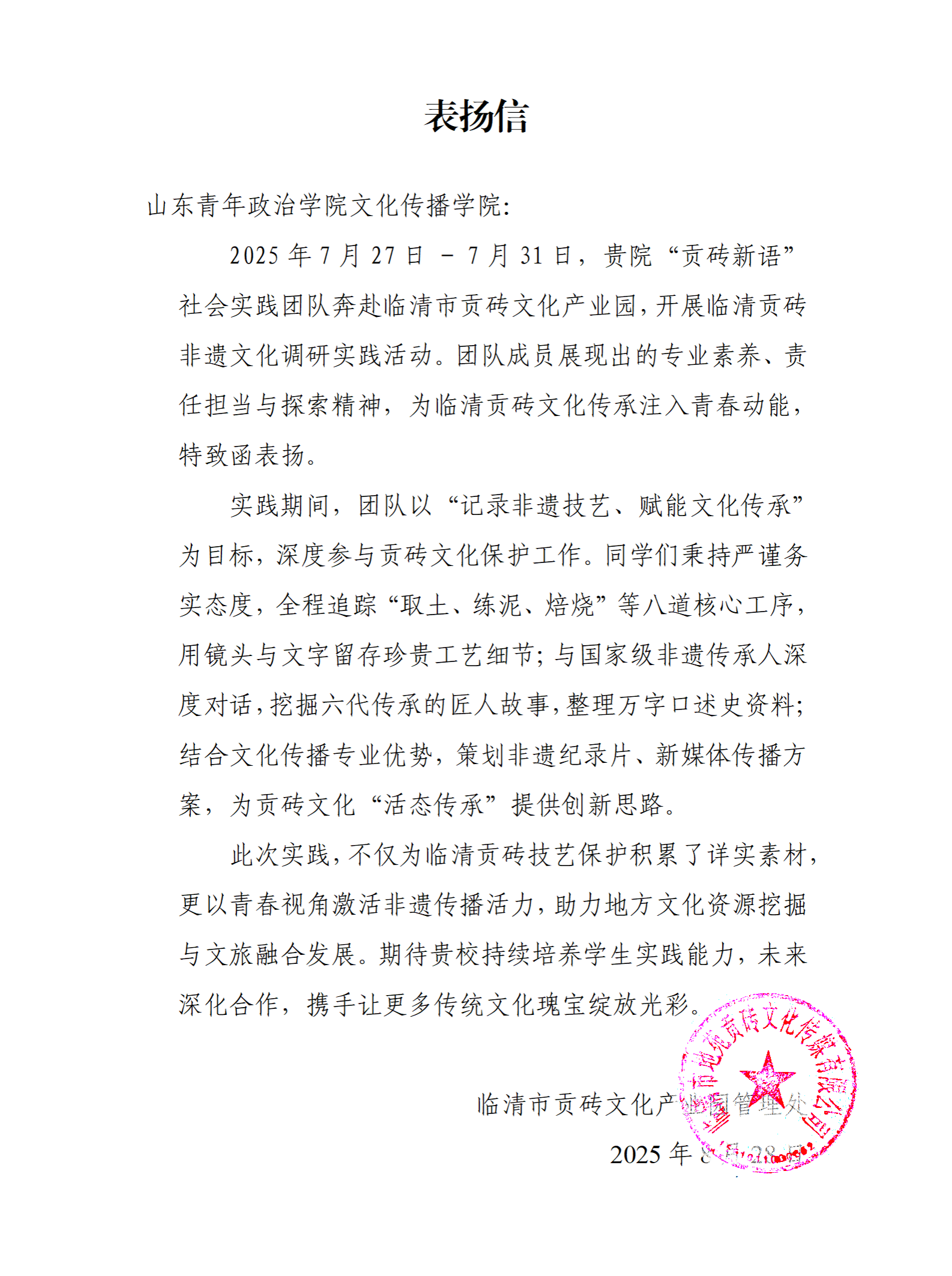 8月28日,山东省临清市文化站向山东青年政治学院文化传播学院发来表扬信,对沈佳蕾、温歆伟、许文琪等五名学生在临清开展的贡砖活化调研活动给予高度肯定。