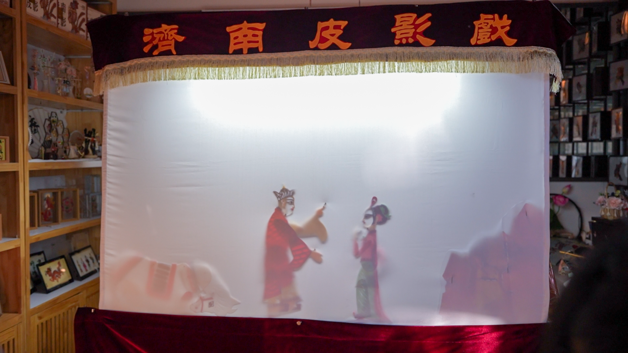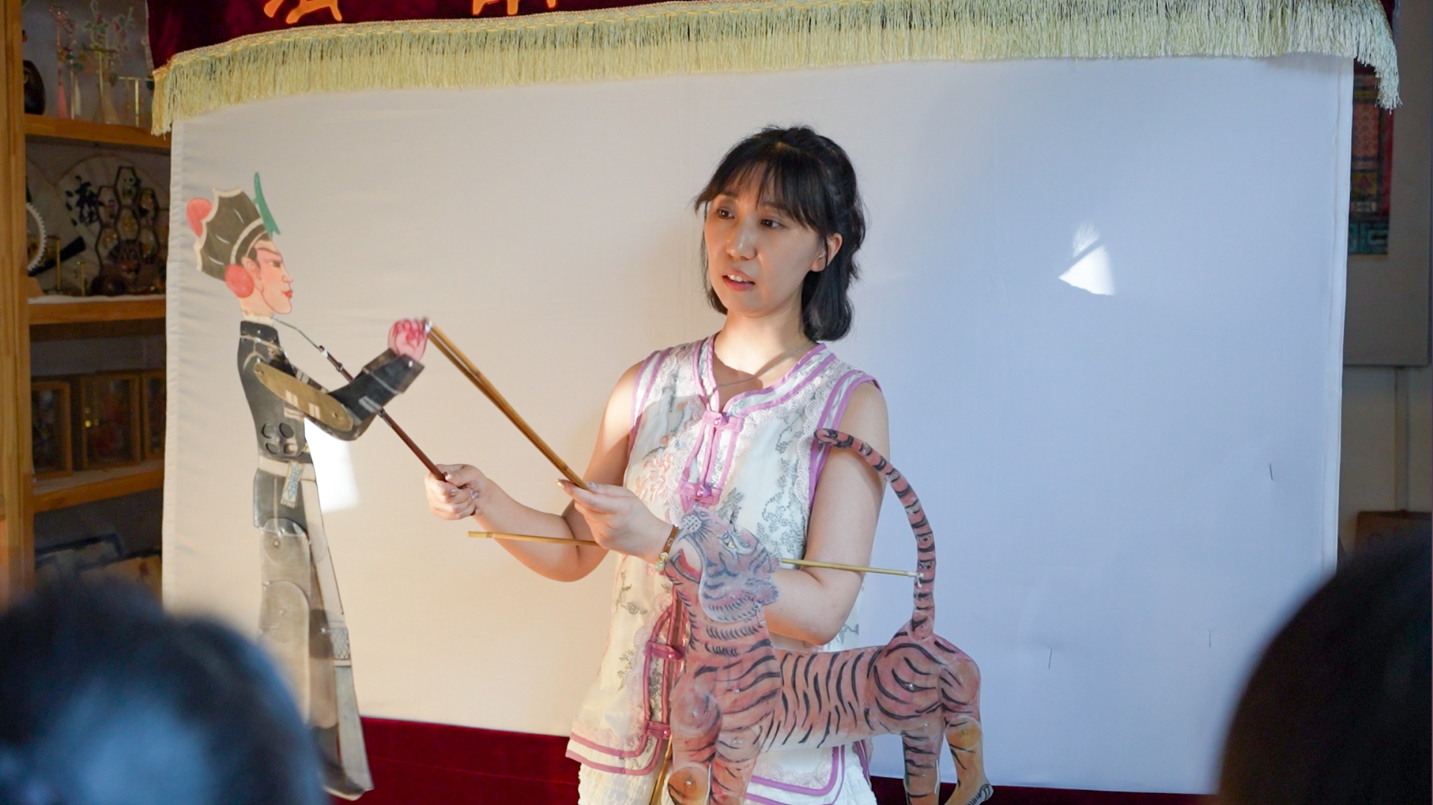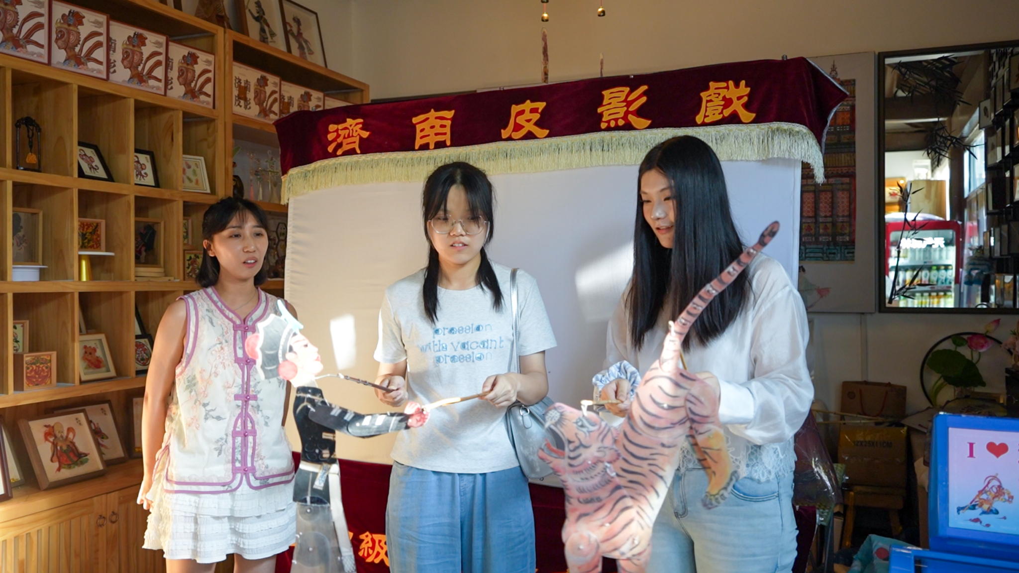 表演结束后,成员们与皮影老师深入互动。在老师指导下,两名成员尝试操纵皮影,看似简单的动作实则对力度与协调性要求极高,让成员们直观体会到皮影演员的匠心。随后,成员们围绕皮影传承发展等内容对皮影老师进行了采访。老师提到,济南皮影戏坚持曲艺风格,融合济南方言与“包袱”,且所有角色声音由皮影老师李娟一人分饰,声线鲜明;同时还积极结合时尚元素走进大众生活。听完讲解,成员们感叹不已,对其传承的重要性有了更深的认知。