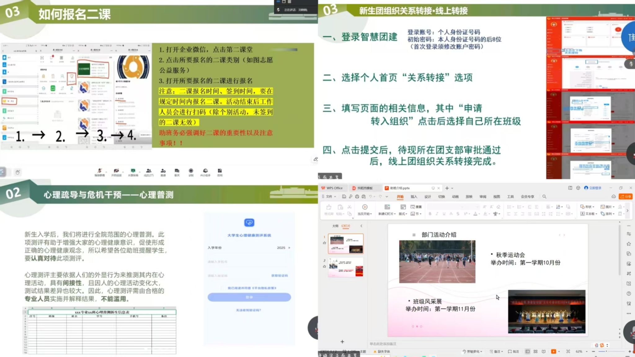 考虑到新生助理辅导员时间灵活性需求,学院于8月25日、26日晚间开启线上培训专场,针对新生助理辅导员高频疑问精准破题。秘书处聚焦办公软件操作、材料格式规范等“基础课”,手把手演示转发流程;宿管部围绕查寝时间、床位调换条件等“民生题”,结合案例详解宿舍管理细则;纪检部针对早晚自习纪律、请假规范等“秩序题”,明确违纪界定与处理流程;组织部直面团关系转接材料要求、团日活动录入等“关键题”,分步拆解智慧团建操作步骤;文体部围绕迎新晚会时间安排、文体活动类型等“活力题”,提前剧透班级风采展、129大合唱等活动亮点;青权部聚焦心理问卷填写、新生心理疏导等“暖心题”,分享心理健康晴雨表使用方法。线上互动环节,新生助理辅导员实时提问,部门负责人即时解答,实现“答即所问”。