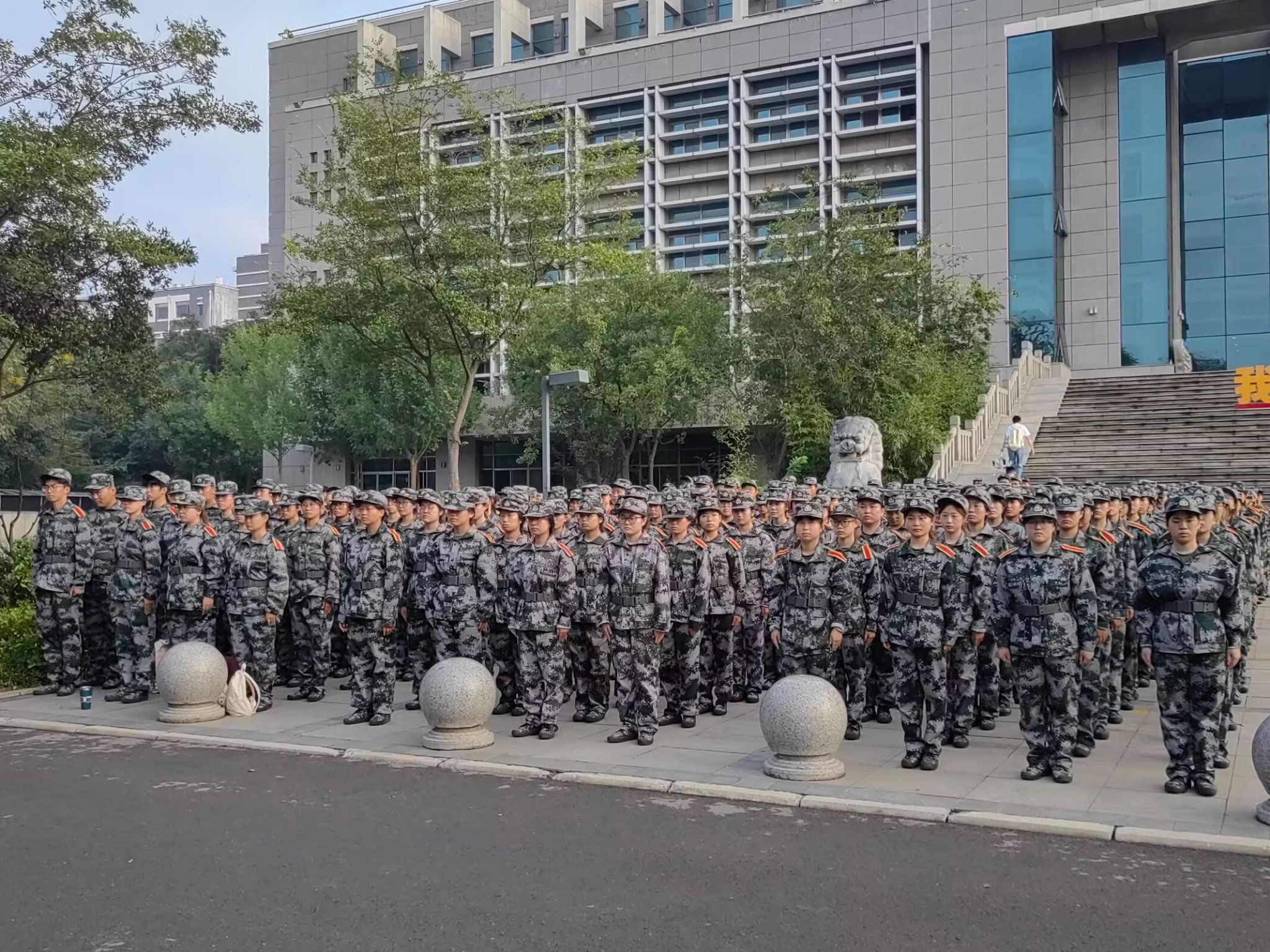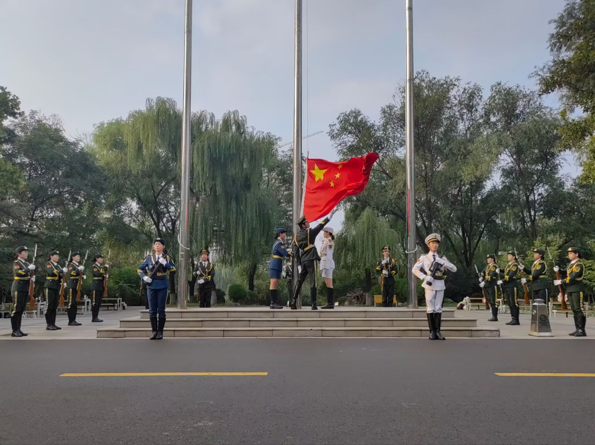 在晨曦微光中,国旗护卫队成员迈着整齐铿锵的步伐,庄重护送五星红旗至升旗台。伴随激昂的国歌,国旗冉冉升起,2025级新生们挺直身姿、目光坚定地追随国旗,崇敬与自豪写满脸庞,尽显新时代青年风采。