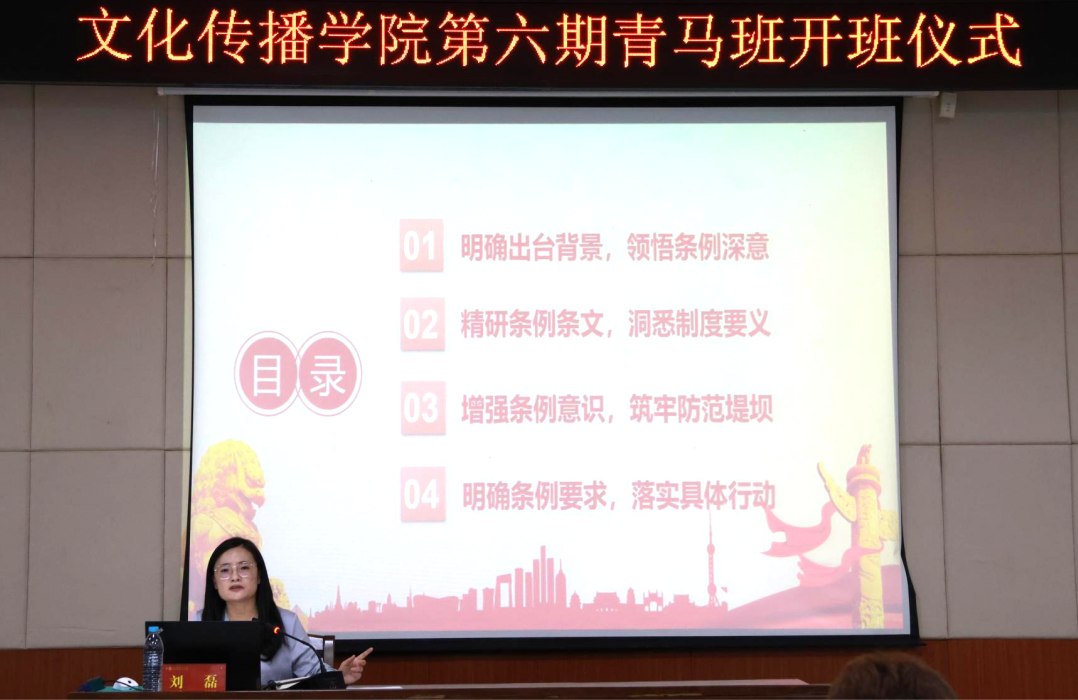 仪式结束后,学院团总支书记刘磊以解读《中国共产主义青年团纪律处分条例》为青马学员讲授了开班第一课。授课过程中,她对全体学员提出要严格以团的纪律标准要求自己,在持续学习中将遵规守纪内化于心,严以修身、防微杜渐。