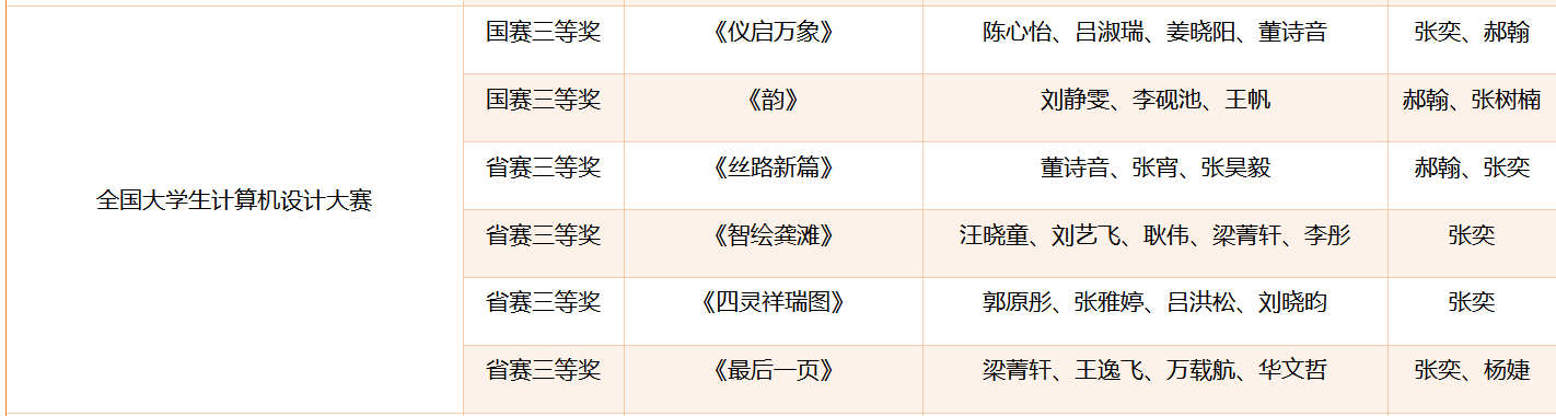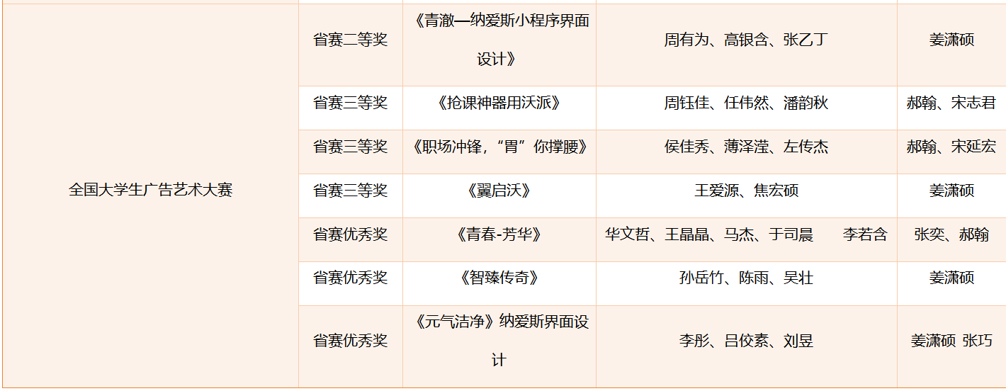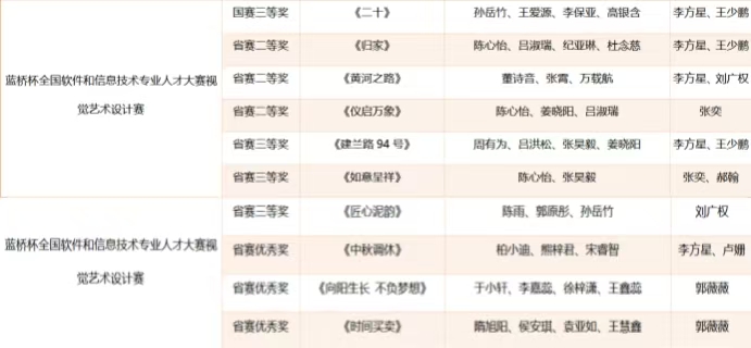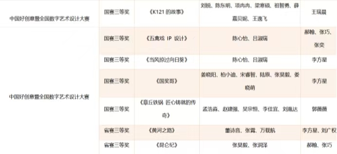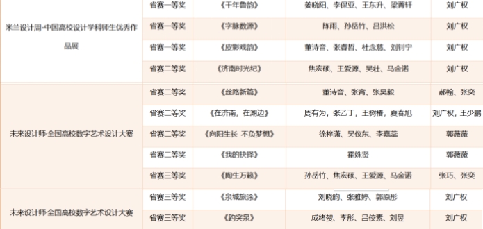 省级奖项方面,团队同样收获颇丰,共获33项荣誉:米兰设计周赛事获省级一等奖3项、二等奖1项,蓝桥杯视觉艺术设计赛获省级二等奖3项、三等奖2项、优秀奖3项,未来设计师大赛获省级二等奖4项、三等奖3项,全国大学生计算机设计大赛获省级三等奖4项,全国大学生广告艺术大赛获省级二等奖1项、三等奖3项、优秀奖3项,中国好创意大赛获省级三等奖2项。