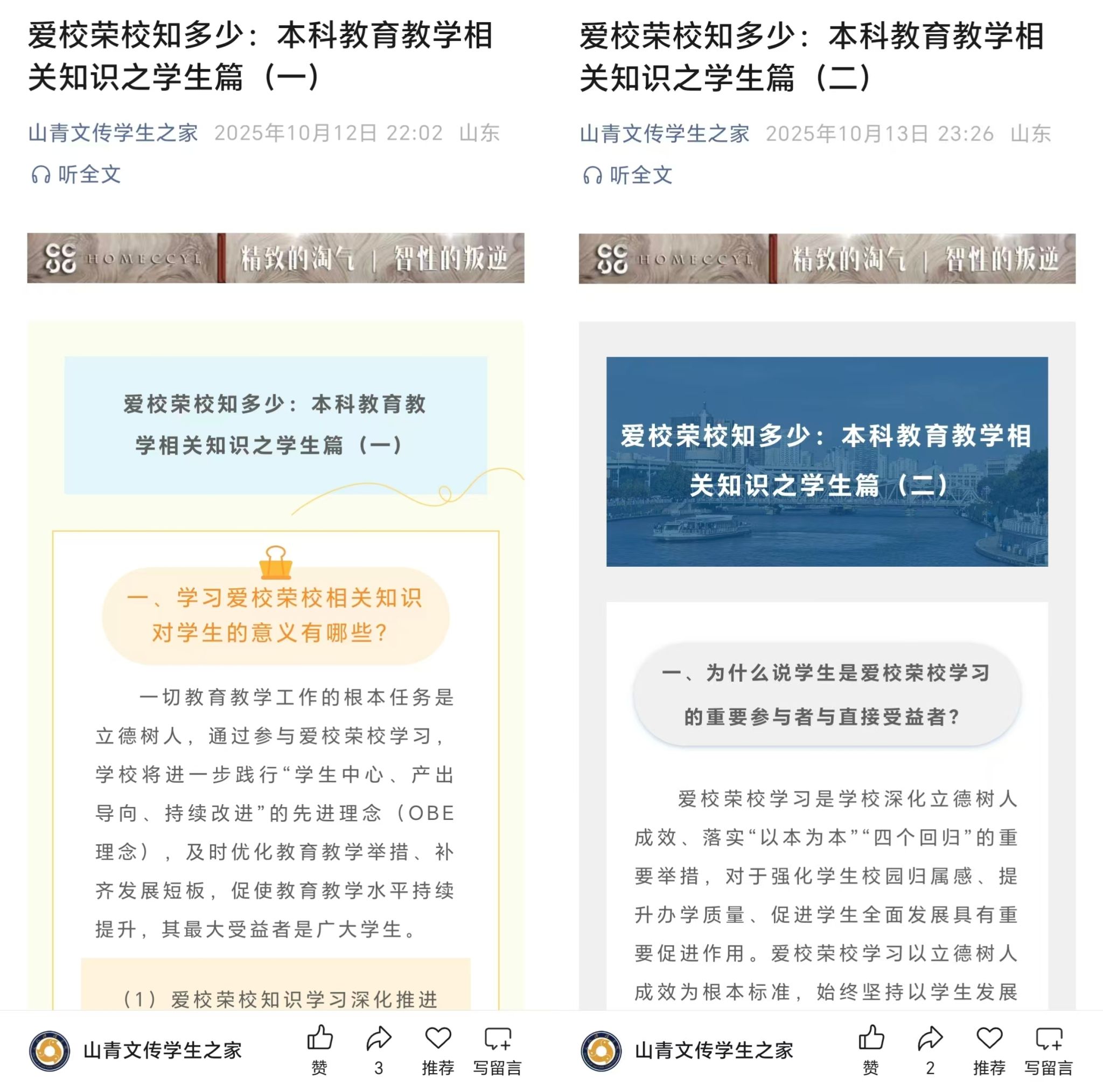 学院推出“爱校荣校知多少”系列推文,系统阐释校史文化、办学理念、发展目标,深度解析“学生中心、产出导向、持续改进”的丰富内涵。推文以数据说话、用案例明理、让师生代言,实现校情校史“随时学、轻松记、广泛谈”。为让文字中的校史“活”起来,学院同步组织2025级新生走进校史馆,开展实地学习活动,让校史记忆在沉浸式学习中愈发鲜活,荣校情怀在“读史”与“见史”的融合中扎根学生心底。