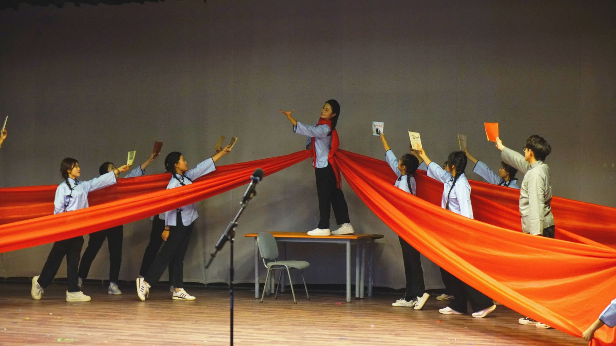 本次活动各班围绕主题深情演唱经典红色曲目,参演学生队列整齐、精神饱满,在歌声中展现出文传学子朝气蓬勃的青春风貌,也让红色文化在校园里得到了生动的诠释。演出中,现场舞台亮点频出。各个班级创新融入情景剧、朗诵、舞蹈和乐器等元素,通过多声部轮唱、领唱与伴舞等形式,增强了舞台感染力。活动现场气氛热烈,掌声不断。