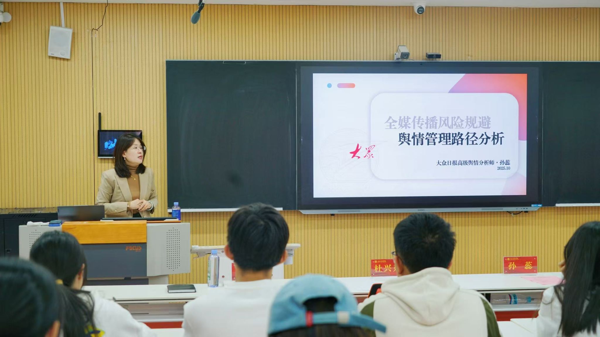 孙蕊以“全媒传播风险规避和舆情管理路径分析”为题,结合融媒体时代的内容传播逻辑与典型舆情案例,系统讲解了舆情演变规律、研判方法及风险规避策略。她指出,在全媒体环境下,高校宣传工作者应当树立正确的舆论导向意识,增强信息甄别与内容把关能力,做到“心中有底线、笔下有分寸”,希望同学们在今后的实践中,能够主动提升媒介素养,善用传播规律,审慎对待舆情,以专业、负责的态度开展新闻宣传工作,为营造清朗的网络空间贡献青春力量。
