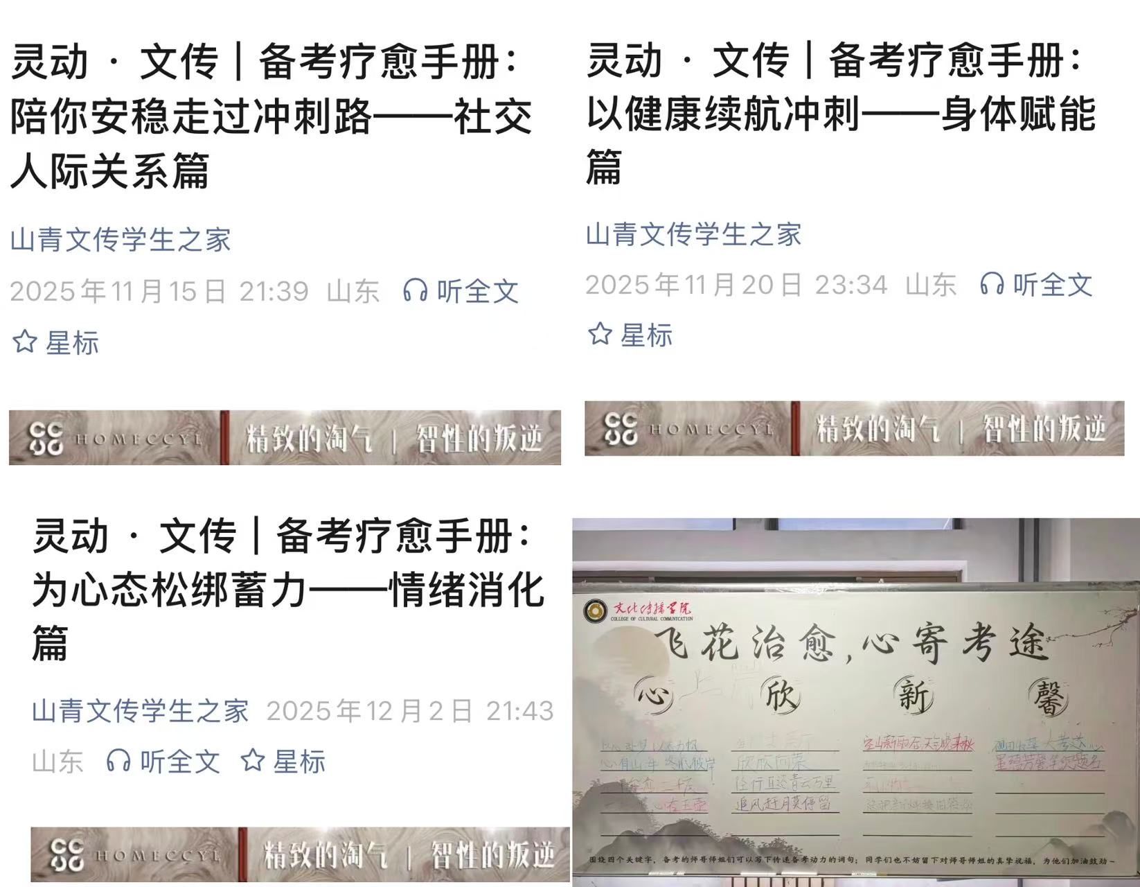 学院以“趣味解压+科学赋能”双线发力,为备考学子筑牢心理防线。开展“飞花治愈,心寄考途”创意展板活动,引导学生们书写励志词句、分享备考感悟,在朋辈共情与鼓励中释放焦虑;推出“备考疗愈手册”系列推文4篇,从“情绪消化”“身体赋能”“社交人际关系”“学习策略”四大维度,传授情绪急救、健康作息、人际沟通等实用技巧,用科学方法稳固备考心理防线,为备考学子搭建了情绪释放与心理疏导的平台。