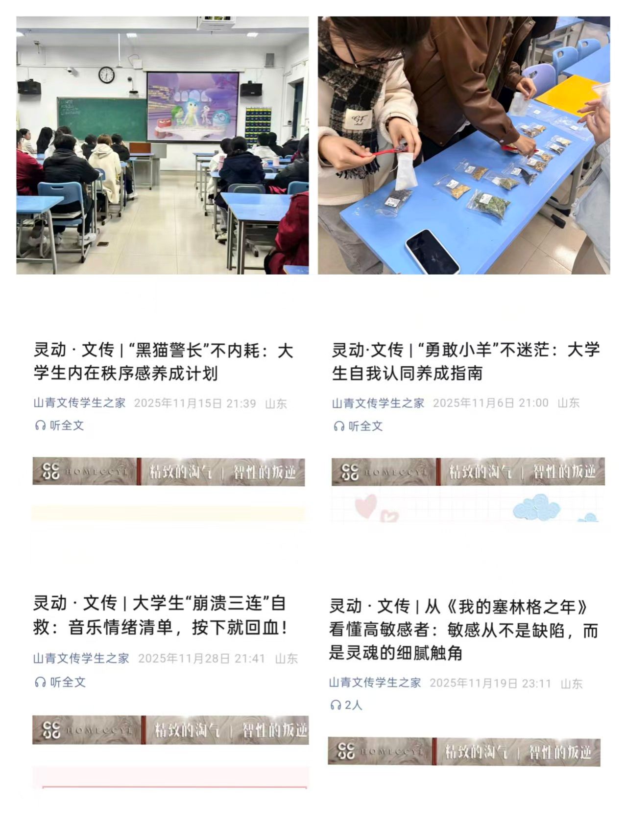 聚焦学生心理健康需求,打造沉浸式、多维度的心理关怀活动。推出动画科普、音乐疗愈、心理电影解析等方面主题推文4篇,将文艺作品疗愈路径融入日常场景,引导学生悦纳自我、缓解压力;开展心理电影观影活动,通过心理类经典影片传递温暖力量,在沉浸式观看中看见自我、读懂情绪;举办香料疗愈手工活动,邀请学生亲手制作香囊,在动手实践中解锁直观可感的心理调节技巧。此次系列活动,充分营造了温暖治愈的心理关怀氛围,助力学生以积极心态应对成长困惑,在心灵滋养中稳步前行。