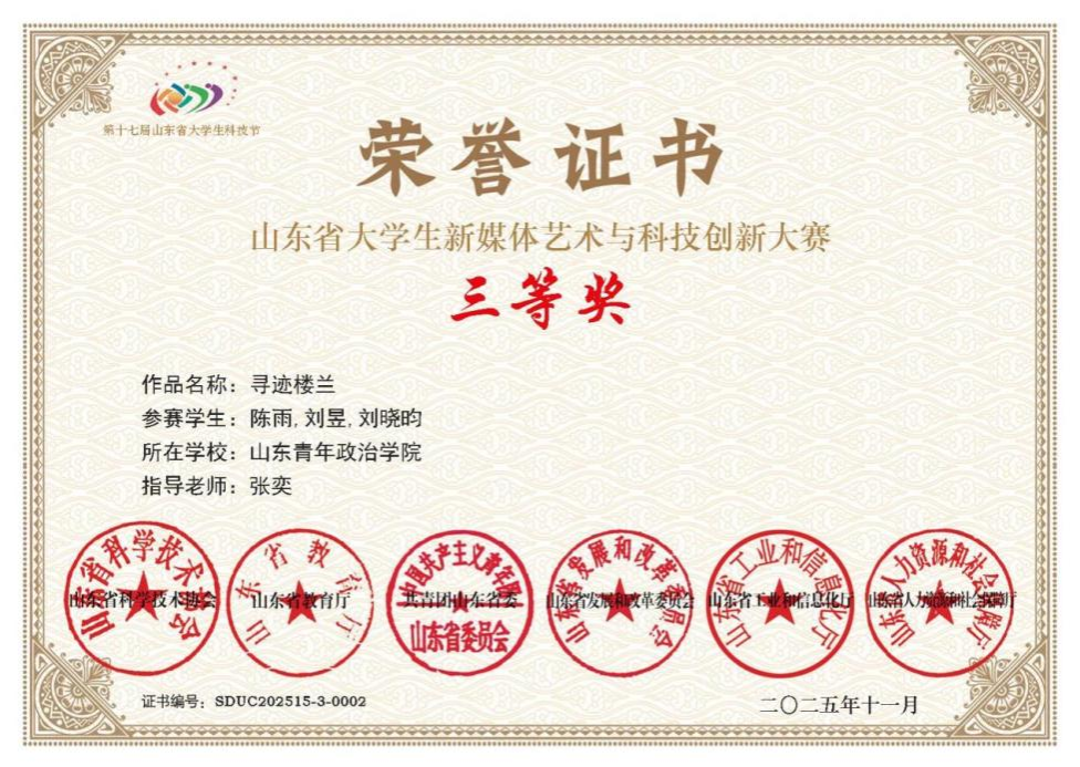 由张奕指导,2023级数媒专业学生陈雨、刘昱、刘晓昀创作的《寻迹楼兰》获三等奖。