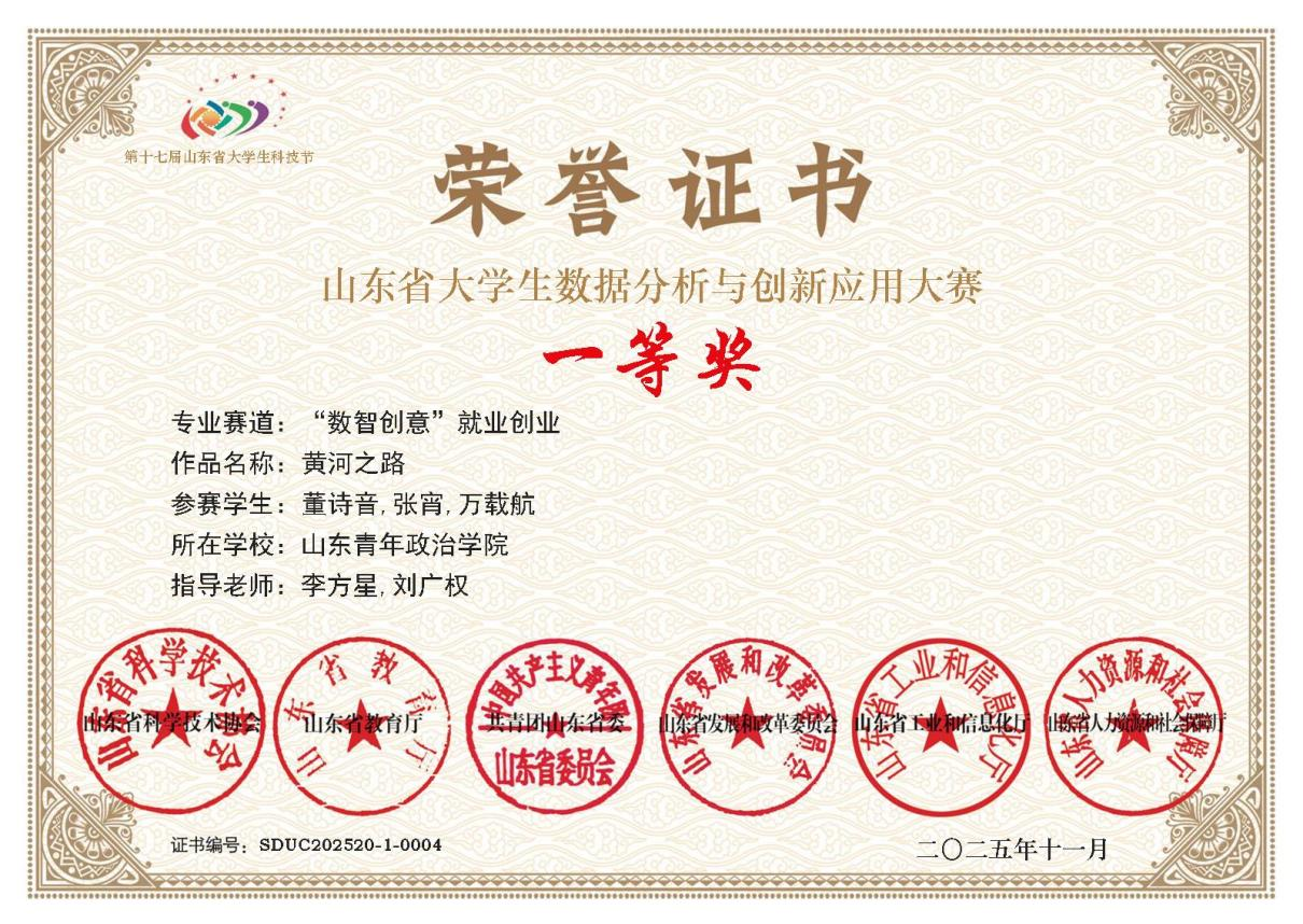 在“山东省大学生数据分析与创新应用大赛”中,由李方星和刘广权共同指导,2023级数媒专业学生董诗音、张宵、万载航创作的AIGC影片《黄河之路》获一等奖。