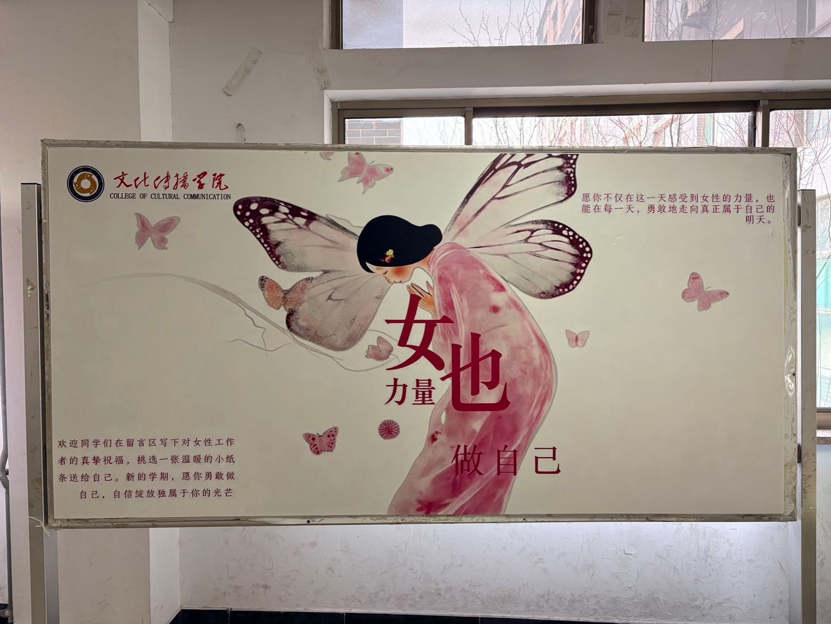 为庆祝三八国际劳动妇女节,致敬身边女性工作者,引导青年学子感受女性力量、树立自信自爱的成长理念,3月8日至3月15日,文化传播学院在学院大厅举办“她力量·做自己”妇女节主题活动。