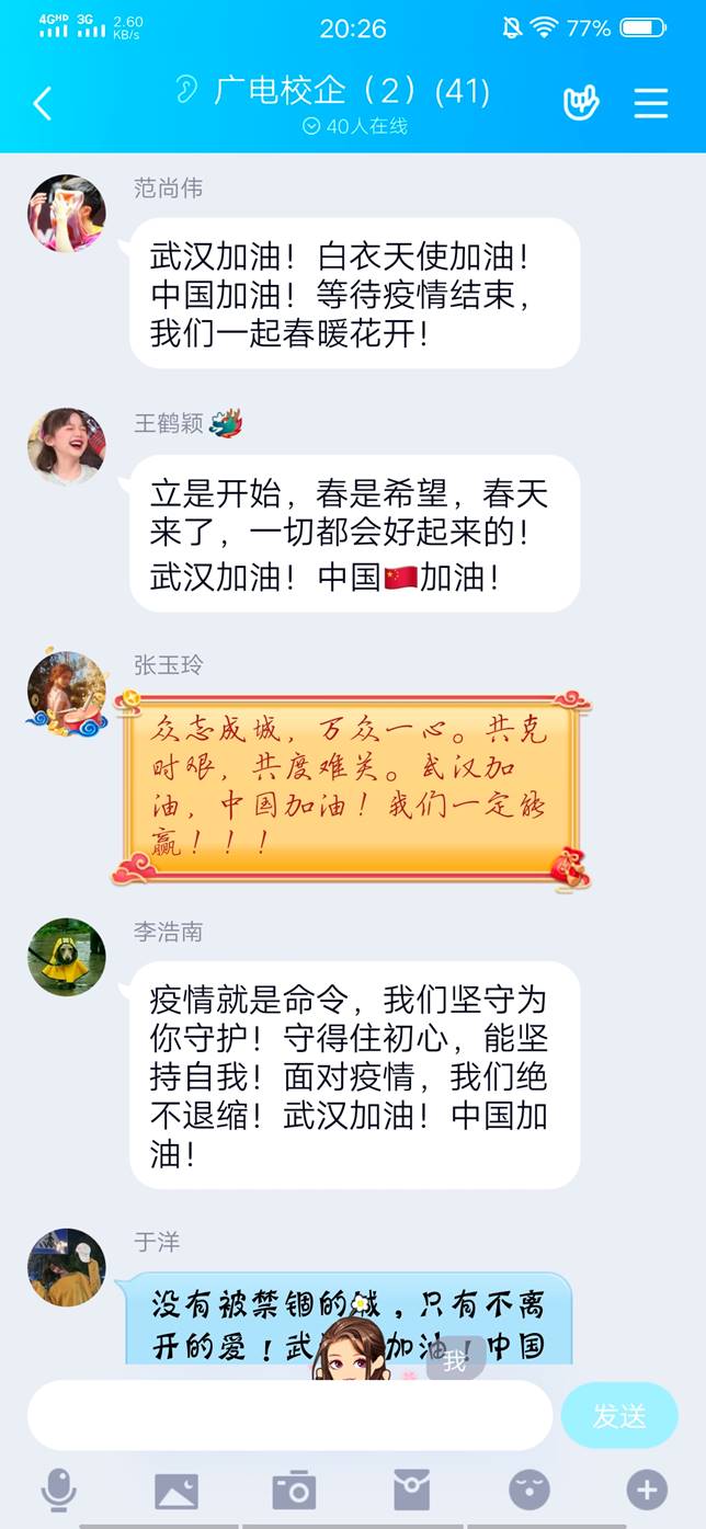 在抗击疫情的关键时刻,学院团员青年始终不忘学生本分,做好假期时间利用规划,坚持借助网络资源平台自主学习和提升。各班级团支部掀起阅读分享活动的潮流,同学们时时分享自己的阅读书目,畅谈品读赏析过程中所思所想,互相学习共同进步,受益良多。大家也积极担负起大学生的责任与担当,在积极响应号召,全力做好个人防护的同时,为武汉送上热切的视频祝福、文字祝福,众志成城共同战“疫”。