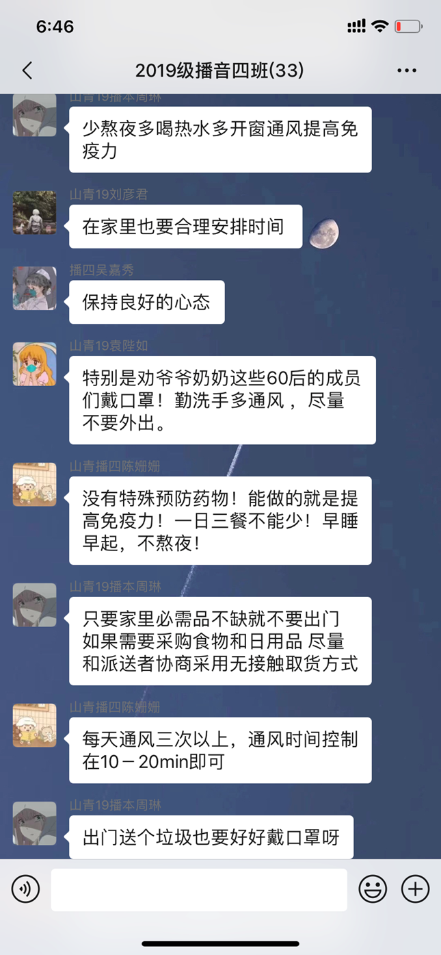 同时,为丰富同学们的抗疫防护知识,学院多措并举开展疫情防控专项学习系列活动,组织同学们进行“防疫健康教育知识”网络微课学习,观看山东省教育厅播出的《新课堂——同心战“疫”特别节目》,同时由各班级团支部委员在微信群内领学相关科普知识及文件通知,并就个人防护措施等内容展开热烈讨论。通过专业的防疫知识学习,同学们加深了对新冠病毒的认识,能够理性看待疫情,做到不相信谣言、不传播谣言。