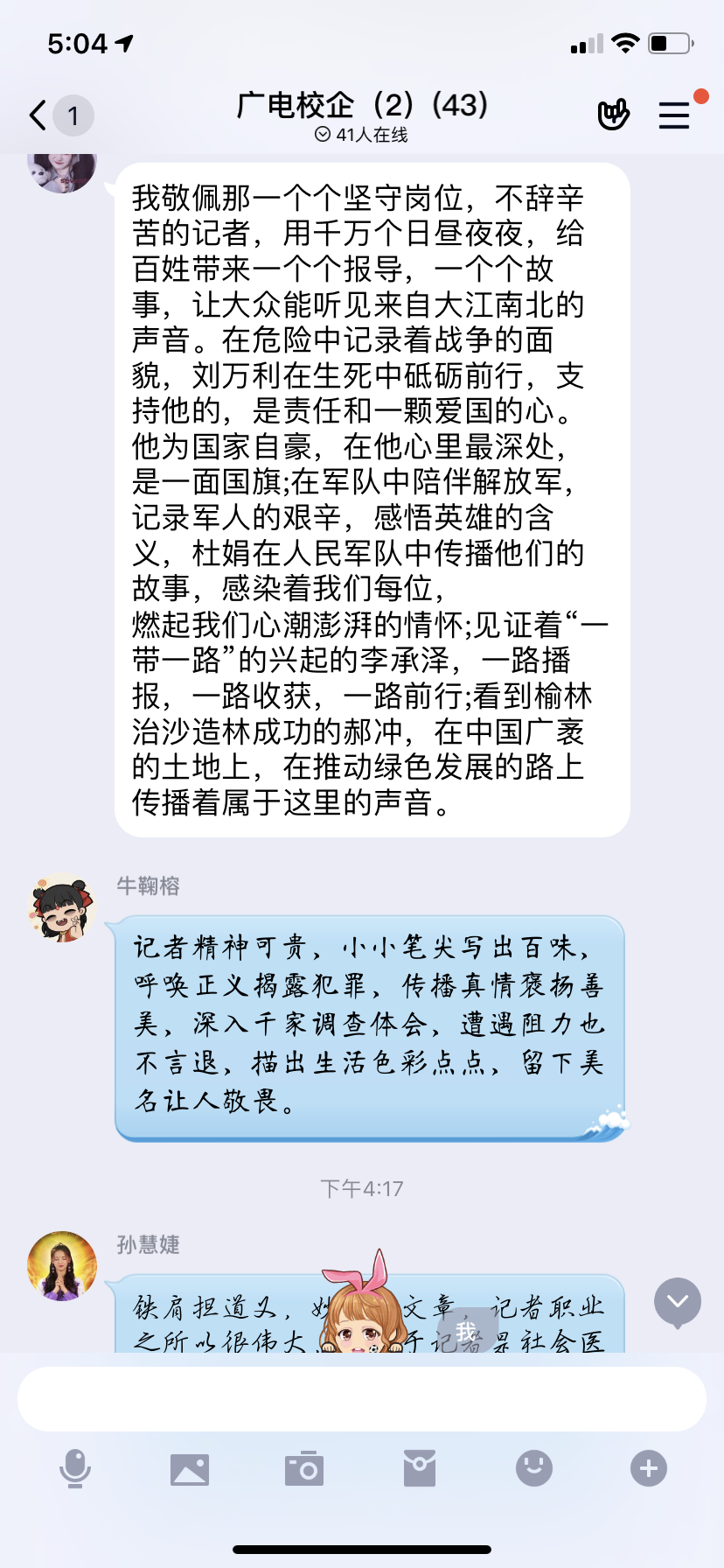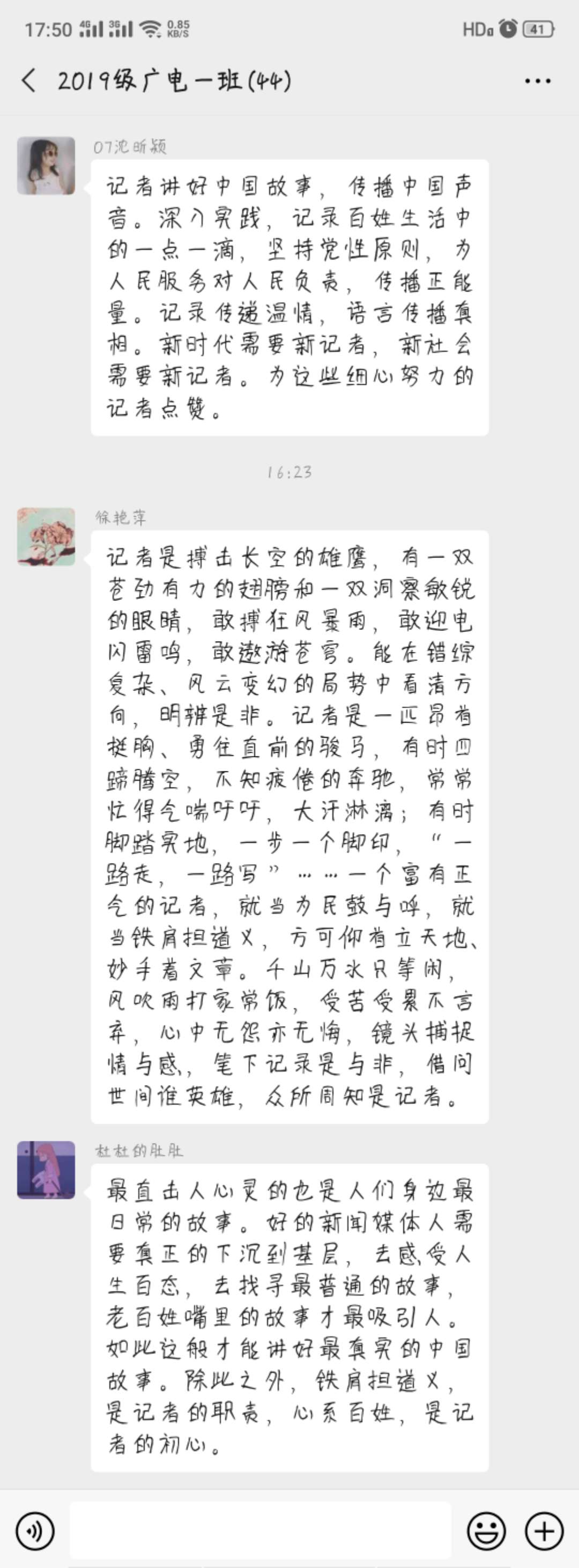 在活动结束后,广电专业各班级就直播内容与心得体会展开了热烈讨论,纷纷对当代记者的敬业精神表示敬佩与赞赏,对自身未来从事相关工作应承担的社会责任有了更加深刻的理解。2018级广电专业1班朱悦青表示,记者铁肩担道义,真正聚焦和深入基层、了解群众,反映人民呼声与诉求,用高尚的家国情怀,砥砺着坚定前进的初心;2019级广电专业1班的吴在恩表示,记者们四季行千里,笔下有真情,用一篇篇报道、一段段视频记录着时代发展与社会变迁,他们是真正的无冕英雄,是广大相关专业学子学习的榜样。