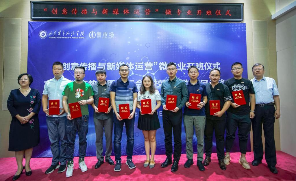 9月20日,山东青年政治学院文化传播学院联合壹市场开设的“创意传播与新媒体运营”微专业开班仪式圆满举行。山东青年政治学院党委委员、副院长陈雨海,教务处处长孟繁兵,文化传播学院院长刘绍芹、党总支书记王连峰,济南报业集团副总编辑樊祥钦,壹市场创始人潘小双,联合创始人兼首席知识官宋正,以及来自开创集团、新视觉数码科技、妙音传媒、星探传媒、华仁教育、百事可乐、西门子、格力空调、保时捷、福瑞达美业、华硕电脑、好阿婆、可恩口腔、半天妖烤鱼、麒麟圣德、山东广电星空MCN、百度内容创业中心、砍柴书院、澜灵传媒、淏霖传媒等三十多家企业负责人和营销高管共同出席本次活动。文化传播学院微专业所有课程版块的负责教师、微专业班全体同学参加了仪式。开班仪式上,对微专业产业教授、产业导师和产业教师颁发了聘书。