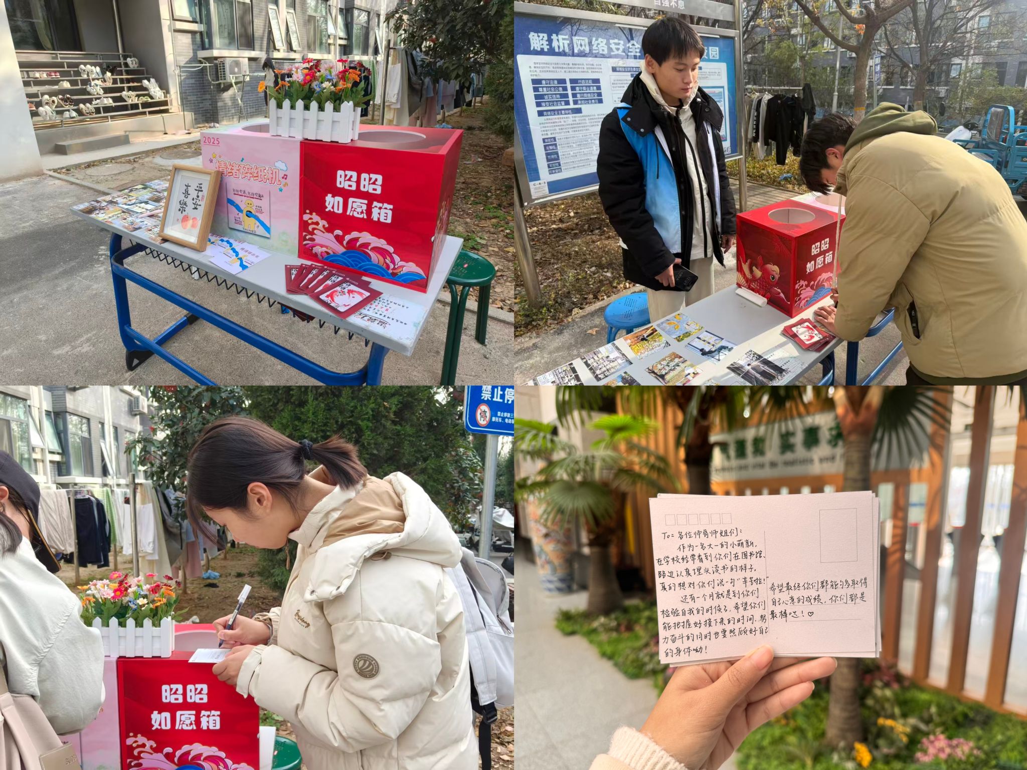 为助力考研学子坚定信念、缓解压力,11月20日,文化传播学院于4号、6号宿舍楼精心设立专属点位,开展“下一站,上岸!”——许愿季・解忧行・祝福签活动。活动以“昭昭如愿箱”和“情绪碎纸机”为核心设置了写下心愿投入心愿箱、书写烦恼投入碎纸机、随机抽取师生祝福明信片三个环节,让考研学子许下心愿、丢掉烦恼、收获温暖。