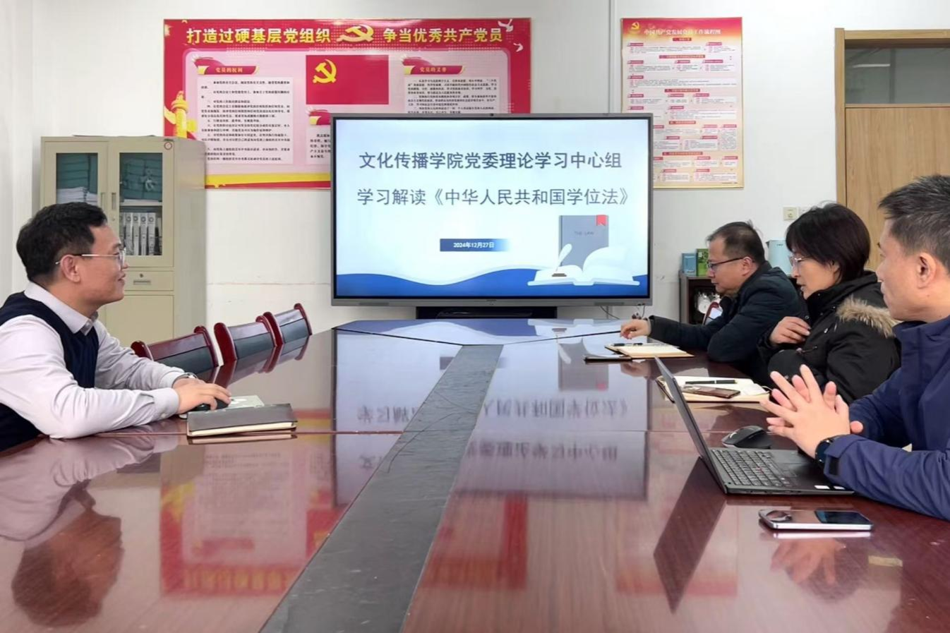 12月27日,文化传播学院党委理论学习中心组开展集体学习,专题学习解读《中华人民共和国学位法》。学院党委书记杜兴东领学,理论学习中心组全体成员参加学习。