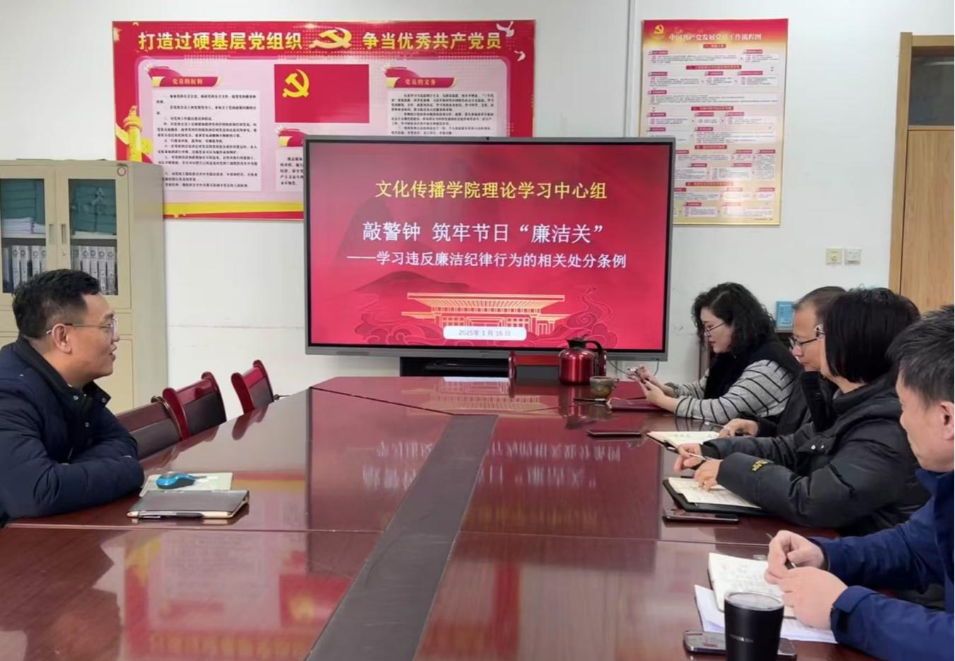 1月16日,文化传播学院党委理论学习中心组开展节前廉政警示教育集体学习,专题学习中央八项规定精神及《中国共产党纪律处分条例》中违反廉洁纪律行为的相关处分条例。学院党委书记杜兴东领学,理论学习中心组全体成员参加学习。