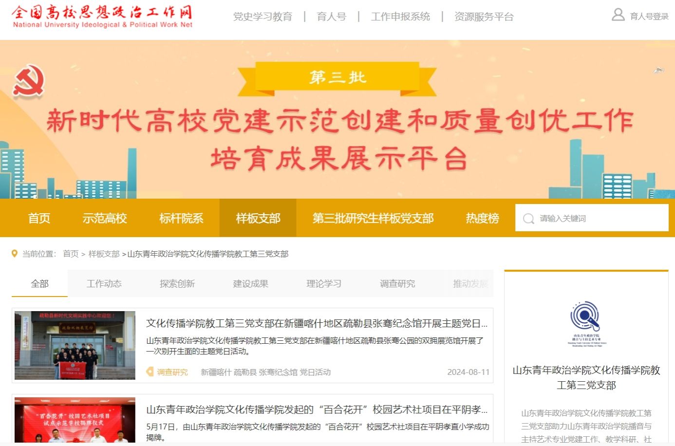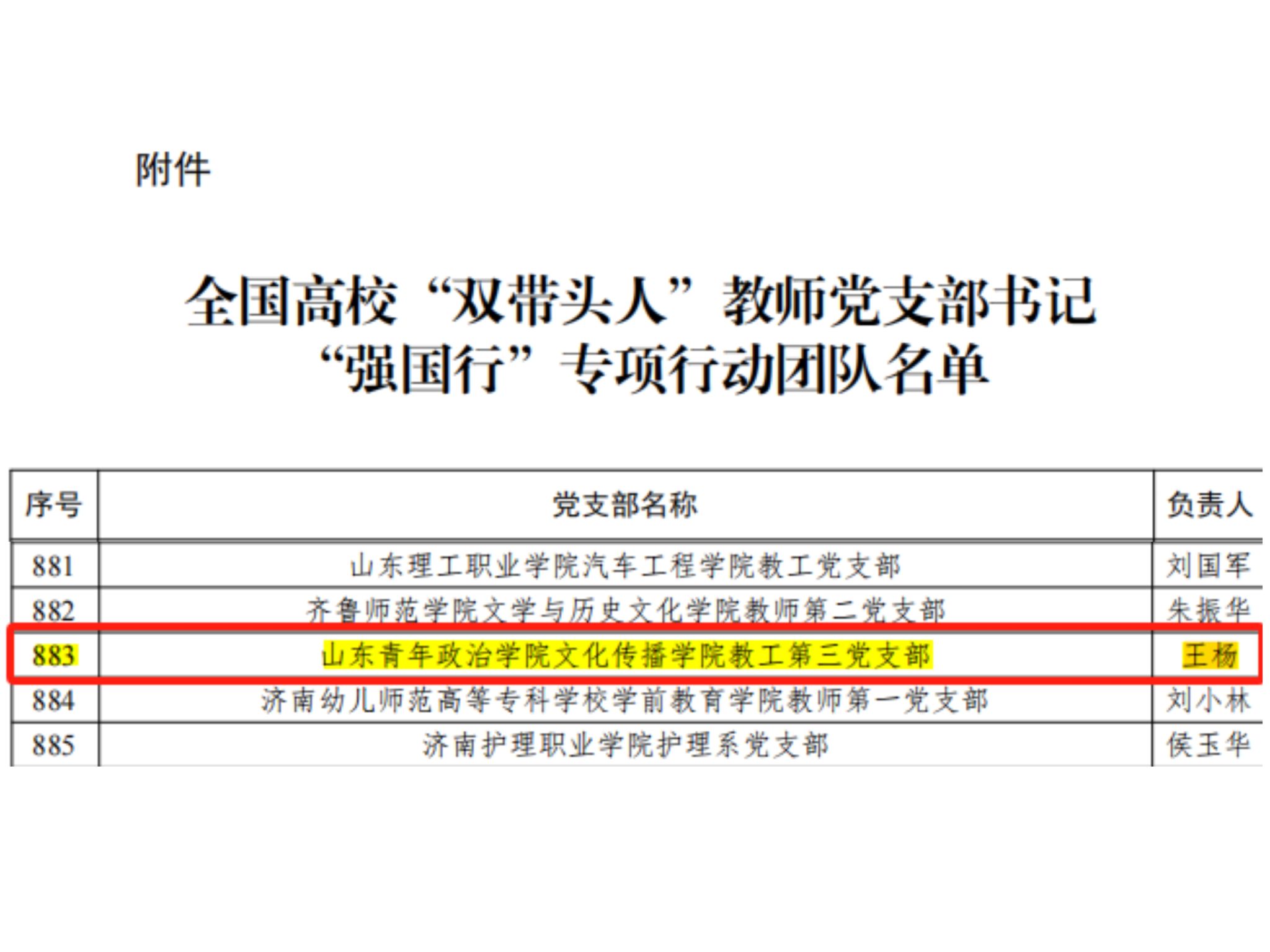 今年,教育部组织开展高校“双带头人”教师党支部书记“强国行”专项行动,旨在深入贯彻落实教育部党组关于高校“双带头人”教师党支部培育工作部署要求,充分发挥高校“双带头人”的示范引领作用,引导广大教师在以中国式现代化全面推进强国建设、民族复兴伟业新征程上砥砺新担当、展现新作为。10月12日,教育部办公厅公布了全国高校“双带头人”教师党支部书记“强国行”专项行动团队名单,文化传播学院教工第三党支部成功入选。